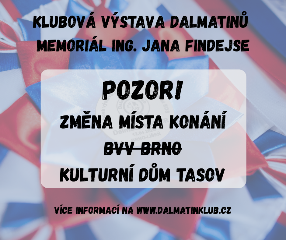 z organizačních důvodů (konkrétně s ohledem na nemožnost garantovat přesný čas zahájení a přesné místo posuzování) jsme se rozhodli ve snaze zajistit plynulý chod výstavy a komfort vystavovatelů výstavu přesunout do jiných prostor. Výstava se uskuteční v Kulturním domě v Tasově (okres Žďár nad Sázavou, přesná adresa je Tasov 37, Tasov, 675 79 Žďár nad Sázavou, kulturní dům je součástí ZŠ a MŠ v Tasově).