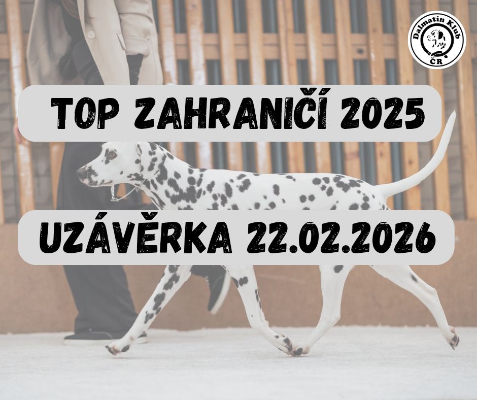 uzávěrka soutěže TOP ZAHRANIČÍ 2025 bude 22.02.2026. Výsledky posílejte na email souteze@dalmatinklub.cz dle pokynů na webu v sekci TOP Zahraničí.